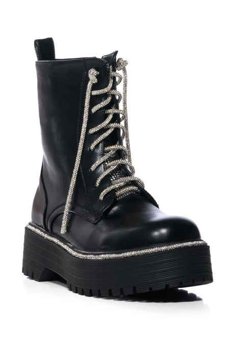 Grab one of our newest killer bling numbers. The AZALEA WANG Attentive Embellished Bootie In Black is made from a faux leather upper and a durable rubber sole. It features a rounded toe silhouette, a rhinestone-embellished lace-up vamp, a coordinating rhinestone-embellished tongue, and a matching rhinestone contrast outlined sole. Complete with a mid-calf height shaft, chunky platform sole, and an inner ankle zipper closure. Wear with your fave pair of denim and a moto jacket for a glam’d up take on the classic bootie look. (All measurements approximate from size 7.5) - Faux leather upper - Rounded toe - 6.5” Shaft height - 1.25” Sole height - Imported Product ID: 335662