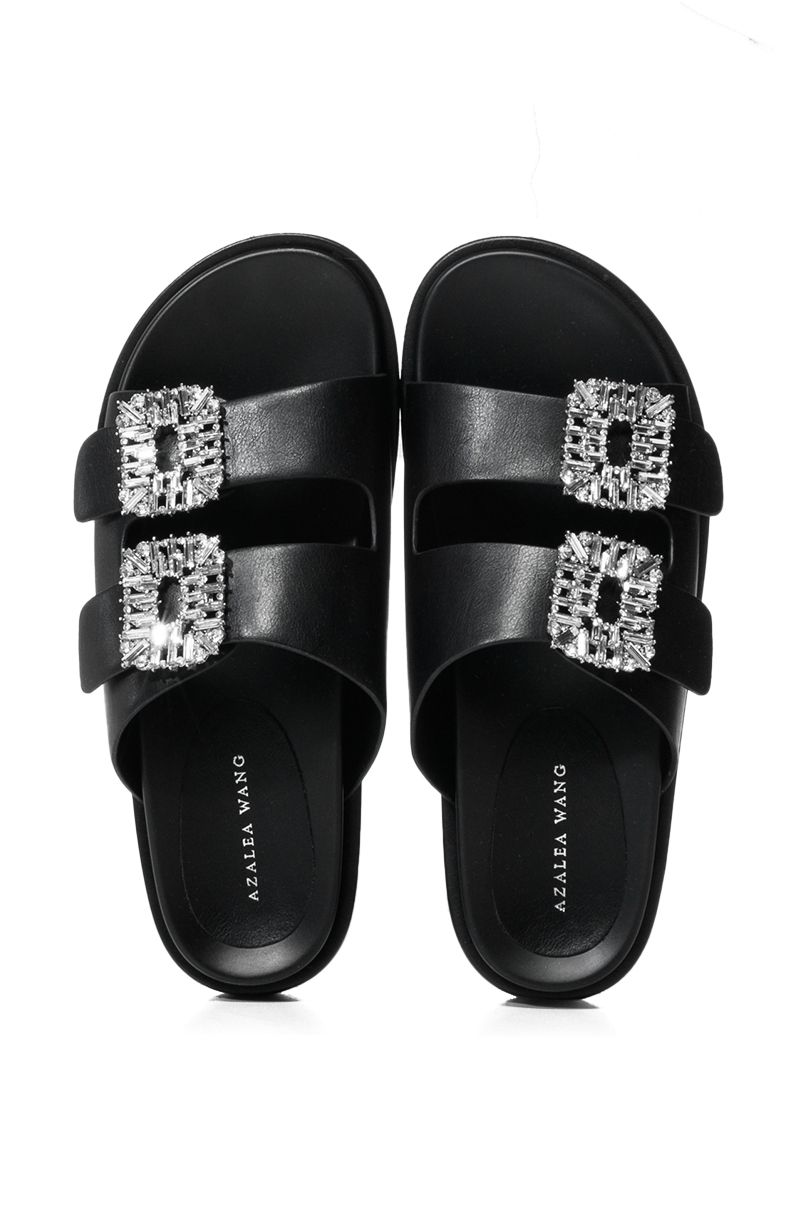 Baddies on the go require The AZALEA WANG Babet Embellished Sandal In Black. These luxe slides feature a faux leather upper, an open almond toe silhouette, rhinestone-embellished faux buckled toe bands, a flatform sole, and a slip-on fit. Pair with a cropped tank and your go-to denim. (All measurements approximate from a size 8): - Faux Leather Upper - Open Almond Toe - Flatform Sole - 1.25” Flatform Sole Height - Imported Product ID: 352779