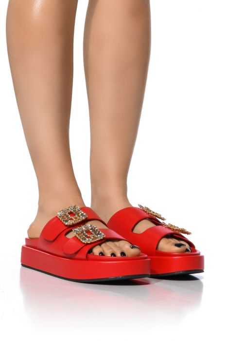 Baddies on the go require The AZALEA WANG Babet Embellished Sandal In Red. These luxe slides feature a faux leather upper, an open almond toe silhouette, rhinestone-embellished faux buckled toe bands, a flatform sole, and a slip-on fit. Pair with a cropped tank and your go-to denim. (All measurements approximate from a size 8): - Faux Leather Upper - Open Almond Toe - Flatform Sole - 1.25” Flatform Sole Height - Imported Product ID: 352788