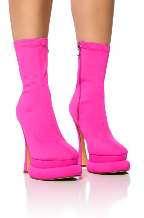 Retro meets modern with The AZALEA WANG Delanie Fuchsia Bootie. This sleek, stretchy shoe features a mid calf shaft, an almond toe silhouette, a towering, sculptured chunky heel, and a bubble platform sole. Complete with a tonal inner ankle zipper closure. (all measurements approximate from size 7.5) - Textile Upper - Mid Calf Shaft - Almond Toe - Chunky Heel - Platform Bubble Sole - 7.5” shaft - 5.75” heel - 1.75” platform - Imported Product ID: 361098