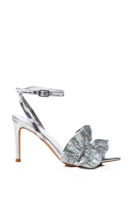 The AZALEA WANG Fallon Silver Scrunchie Sandal features a metallic faux leather upper, an open pointy toe silhouette, a cushioned insole, and a stiletto heel. Complete with a rhinestone embellished scrunchie toe band and a buckled ankle closure. (all measurements approximate from a size 8) - Faux Leather Upper - Open Pointy Toe - Stiletto Heel - 3.75” Heel Height - Imported Product ID: 354911