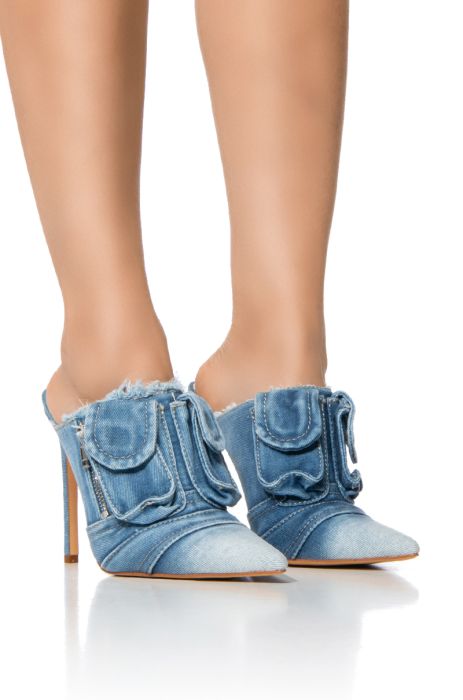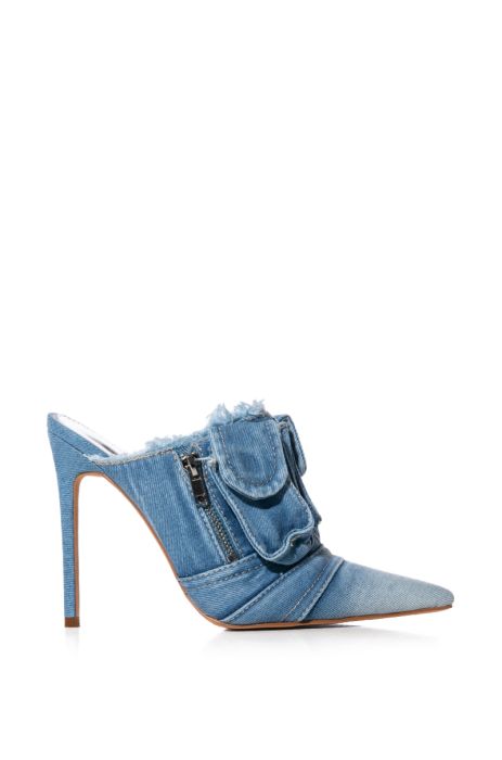 Take the cargo trend to the next level with The AZALEA WANG Freedom Closed Toe Mule Denim. This pump features a denim textile upper, a pointed toe, a mule silhouette, a metallic midsole, a slim stiletto heel, and silver hardware. Complete with functional cargo pockets with velcro closures, faux zipper accents, and distressed detailing. Pair this slip on style with your fave cargo pants and a zip front hoodie for a matchy-matchy look. - Textile Upper - PU Midsole - Rubber Outsole - Pointy Toe - 4.5” Heel (all measurements approximate, measured from size 7.5) - Imported Product ID: 324641