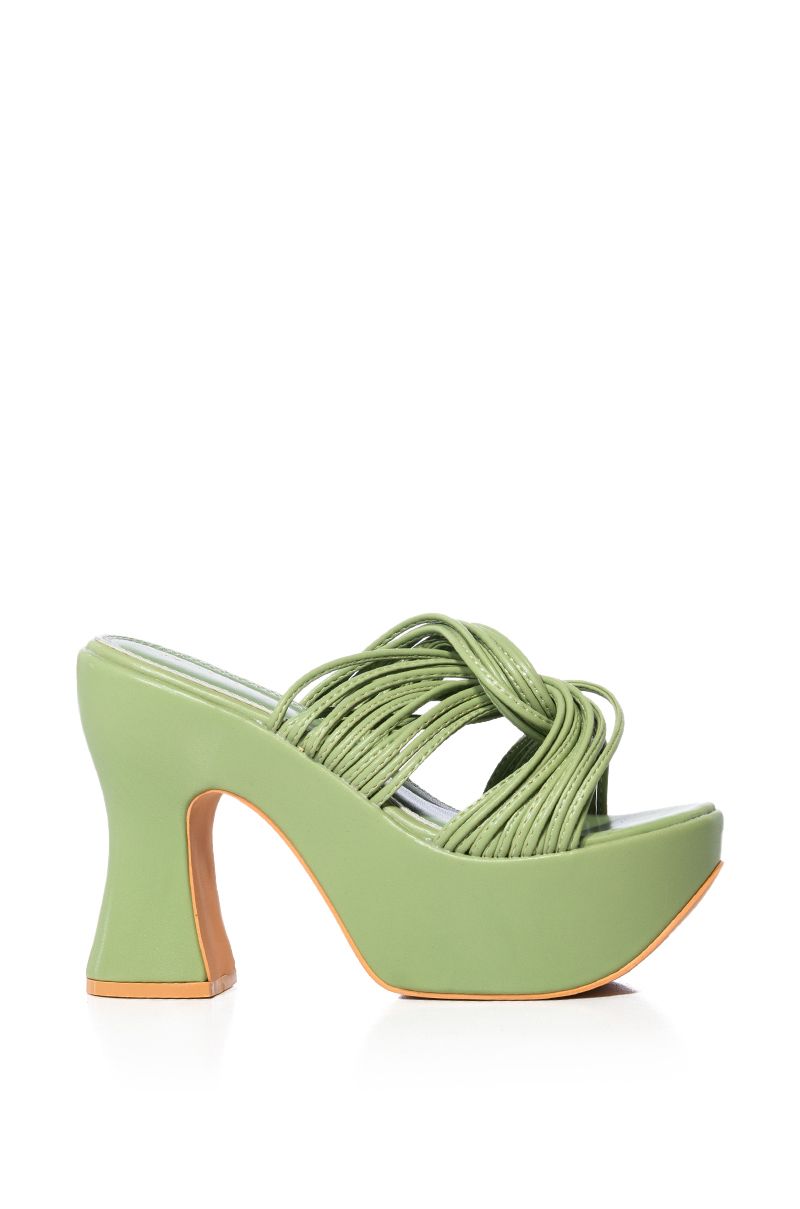 The AZALEA WANG Gail Platform Chunky Sandal In Green is made from a buttery, faux leather upper and features an open almond toe silhouette, a twisted strappy toe band, cushioned insole, a chunky flared heel, step-in mule design, and a platform sole. (all measurements approximate from size 8) - Faux Leather upper - Open Almond Toe - Chunky Heel - Platform Sole - 5.5” Heel Height - 2.25” Platform Height - Imported Product ID: 348893