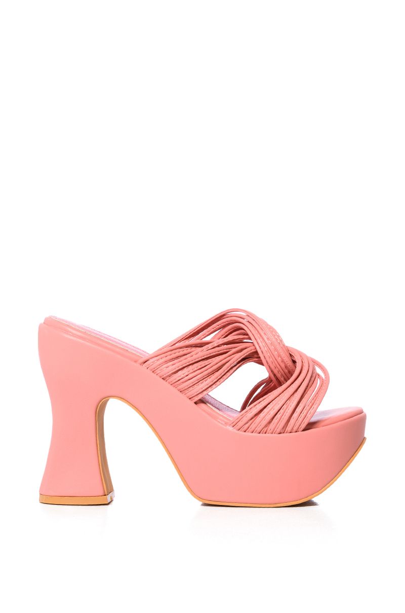 The AZALEA WANG Gail Platform Chunky Sandal In Pink is made from a buttery, faux leather upper and features an open almond toe silhouette, a twisted strappy toe band, cushioned insole, a chunky flared heel, step-in mule design, and a platform sole. (all measurements approximate from size 8) - Faux Leather upper - Open Almond Toe - Chunky Heel - Platform Sole - 5.5” Heel Height - 2.25” Platform Height - Imported Product ID: 348887