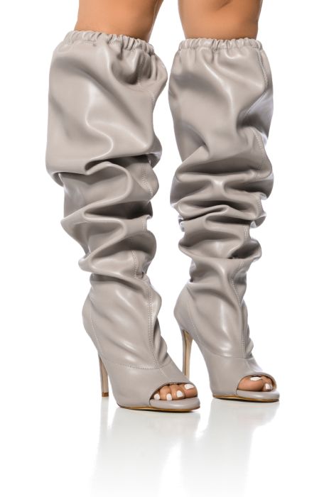 The AZALEA WANG Lainez Open Toe Boot In Grey is a sexy streetwear-inspired boot featuring a slouchy yet stretchy faux leather upper and a thigh design. Complete with an open pointed toe silhouette, a stiletto heel, a pull-on fit, and a cinched elastic thigh. Wear this convertible pair slouched and scrunched or all the way thigh high. (All measurements approximate from size 7.5): - Faux Leather Upper - Thigh High - Pointed Open Toe - Stiletto Heel - 22” Shaft Height - 18” Thigh Circumference - 10.5” Calf Circumference - 4.25” Heel Height - Imported Product ID: 362220