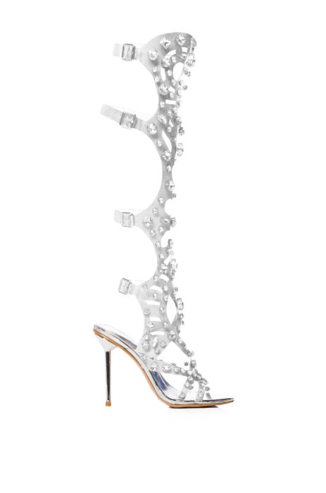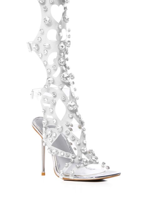 The AZALEA WANG Leanna Embellished Gladiator Sandal In Silver is made from a metallic faux leather upper and features an open square toe silhouette, a cushioned, metallic faux leather insole, and a strappy, buckled, knee-high gladiator shaft with ornate cutouts and rhinestone gem detailing. Complete with a slim, metallic stiletto heel. (All measurements approximate from size 7.5) - Faux leather upper - Open Square Toe - Stiletto Heel - 4.5” Heel Height - 18” Shaft Height - Imported Product ID: 356063