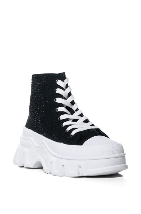 Casual meets glamorous with The AZALEA WANG Libbie Embellished Sneaker In Black. This high top style features tonal rhinestone-embellished textile upper, a classic lace-up vamp, an almond toe silhouette, and a chunky, ridged platform sole. Complete with an ankle height shaft. (all measurements approximate from size 8) - Textile Upper - Rubber Outsole - Almond Toe - 4.25” Shaft Height - 3” Sole Height - Imported Product Id: 347499