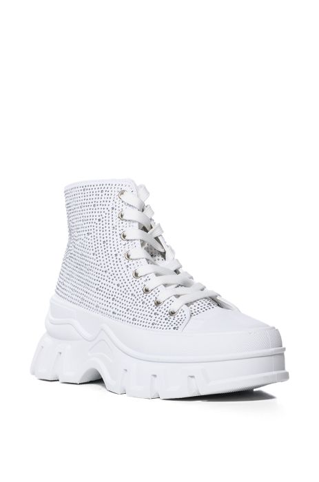 Casual meets glamorous with The AZALEA WANG Libbie Embellished Sneaker In White. This high top style features tonal rhinestone-embellished textile upper, a classic lace-up vamp, an almond toe silhouette, and a chunky, ridged platform sole. Complete with an ankle height shaft. (all measurements approximate from size 8) - Textile Upper - Rubber Outsole - Almond Toe - 4.25” Shaft Height - 3” Sole Height - Imported Product Id: 358308
