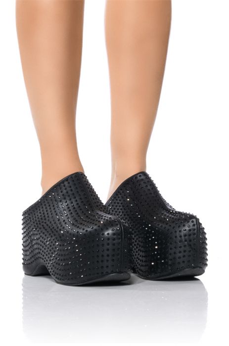 The AZALEA WANG Macy Embellished Clog In Black is made from a faux leather upper and features an almond toe silhouette, studded rhinestone design, a slip-on fit, chunky heel, and a curved platform sole. (all measurements approximate from size 8) - PU Upper, Rubber Sole - Almond toe - Platform sole - 3.5” Heel Height - 2” Platform - Imported Product ID: 335497