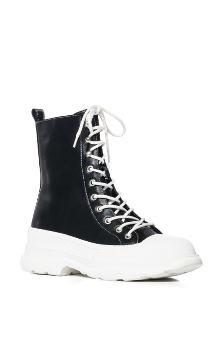 Aways in the know. The AZALEA WANG Never Mistaken Flatform Sneaker in Black Multi is a chic, faux leather sneaker featuring a chunky flatform sole, silver metallic grommets, and a classic lace up design. Complete with a rounded toe, a treaded sole, and an inner ankle zipper. Style with an oversized sweatshirt dress, fishnet tights, and your fave sunnies. - All man-made materials - Model wears a size 8 - Imported -5” upper -3” sole *All measurements are approximate* Product ID: 282652