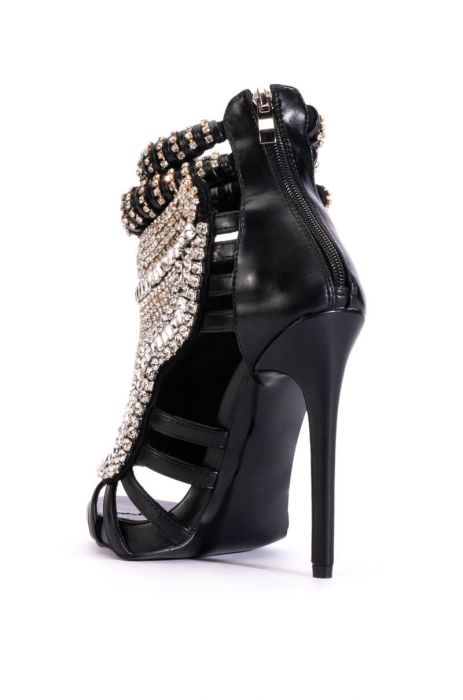 The Azalea Wang Push Your Luck Stiletto Sandal In Black features a faux leather upper, a large rhinestone and gem-detailed centerpiece with cushioned backing, exposed sides, an ankle height shaft, a pointed peep toe, a stiletto heel, and a back ankle zipper closure. Fit and details (approx. measured from a women’s 8): - Peep toe - Stiletto heel - PU upper - 5.75” shaft height - 5.25” heel height - Imported Product ID: 300848