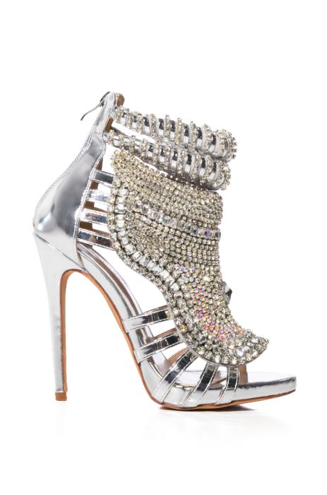 Feeling lucky? The Azalea Wang Push Your Luck Stiletto Sandal In Silver features a metallic faux leather upper, a large rhinestone and gem-detailed centerpiece with cushioned backing, exposed side cut outs, an ankle height shaft, cushioned ankle straps, a pointed peep toe, a stiletto heel, and a back ankle zipper closure. Pair this blinged out sandal with a bodycon mini and silver jewelry for a complete look. (Fit details approximate from size 7.5): - Peep toe - Stiletto heel - PU upper - 5.75” shaft height - 5.25” heel height - Imported Product ID: 317991