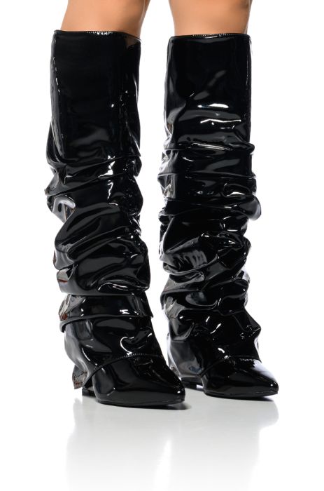 The AZALEA WANG Sif Slouch Wedge Boot In Black is made from a vegan patent leather upper and features a pointed toe silhouette, a slouchy mid-calf height shaft, a cushioned insole, and a slip-on fit. Complete with a covered wedge heel. (all measurements approximate from size 7.5) - Faux Patent Leather Upper - Pointed Toe - Wedge Heel - 18” Shaft Height - 3.75” Heel Height - 17.5" Calf Circumference - Imported Product ID: 336672