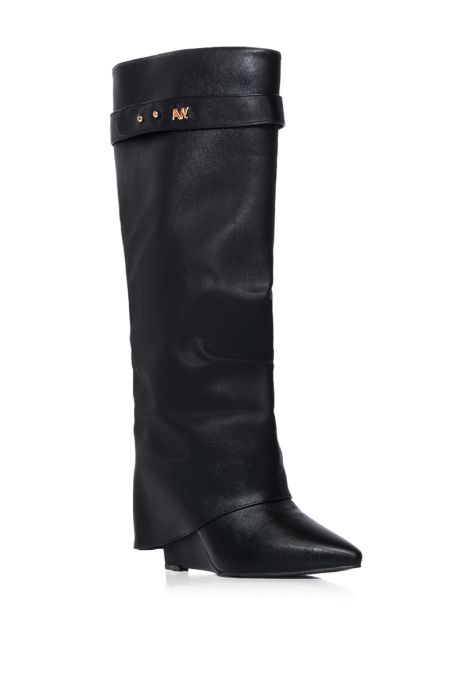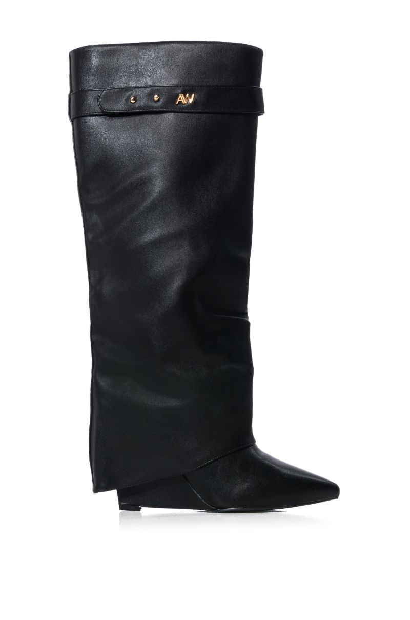 We can't get enough of The AZALEA WANG Stuck On You Fold Over Wedge Boot in Black. This vegan leather boot features a below the knee shaft, a belted detail with metallic AW logo accent, and a covered wedge heel. Complete with a pointed toe, a concealed inner elastic panel shaft for a flexible fit, and slip on fit. This ultra-versatile boot is the perfect transitional wardrobe staple. Pair with slip dresses and trench coats, skinny jeans and knits, or tights and mini skirts for an extra touch of edge. (all measurements are approximate from size 8) - Faux Leather Upper - 15” shaft - 26.5" shaft circumference - 4” heel - Imported Product ID: 272425