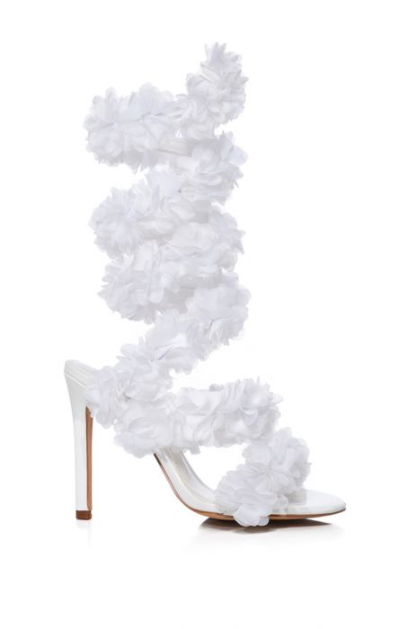 The AZALEA WANG Theodosia Floral Stiletto Sandal In White is made from a faux patent leather upper and features an open almond toe silhouette, a cushioned faux leather insole, toe and foot bands with mesh flower detailing, a stiletto heel, and a coiled ankle band with coordinating mesh flowers that rise up the ankle. (all measurements approximate from size 7.5): - Faux Patent Leather Upper - Open Almond Toe - Stiletto Heel - 9” Shaft Height - 4.5” Heel Height - Imported Product ID: 337111