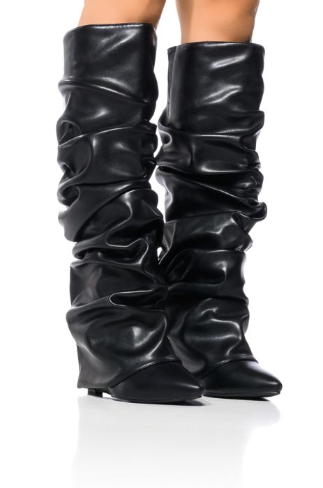The AZALEA WANG Zuma Black Ruched Boot features a faux leather upper, a scrunched foldover mid calf-height shaft, a pointy toe silhouette, and a slightly covered wedge heel. Complete with pull-on fit and an elastic shaft inset for added comfort. (All measurements approximate from size 7.5): - Faux Leather Upper - Mid Calf Shaft - Pointed Toe - Wedge Heel - 14” Shaft Height - 17.5" Shaft Circumference - 3.75” Heel Height - Imported Product ID: 365208