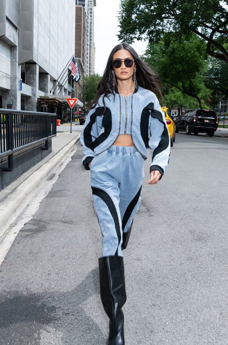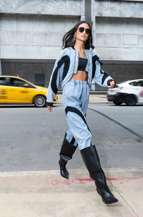 The AKIRA Label Curve Effect Ribbed Trim Denim Bomber is made from a washed, non-stretch denim and features a ribbed knit standing collar, long sleeves with a zipper pocket and ribbed knit cuffs, curved ribbed knit trim along the sleeves and bodice, flap front pockets, a curved front zipper detail, a ribbed knit elastic back band, and a front zipper closure. Style this piece with the coordinating AKIRA Label Curve Effect Ribbed Trim Denim Jogger, a crop top, and chunky sneakers to complete your fresh streetwear look. - 100% Cotton - Imported (All measurements approximate from size small) - 22” Shoulder to Hem - 22.25” Sleeves Product ID: 357303 (All measurements approximate from size 1X) - 26” Shoulder to Hem - 25” Sleeves Product ID: 357307