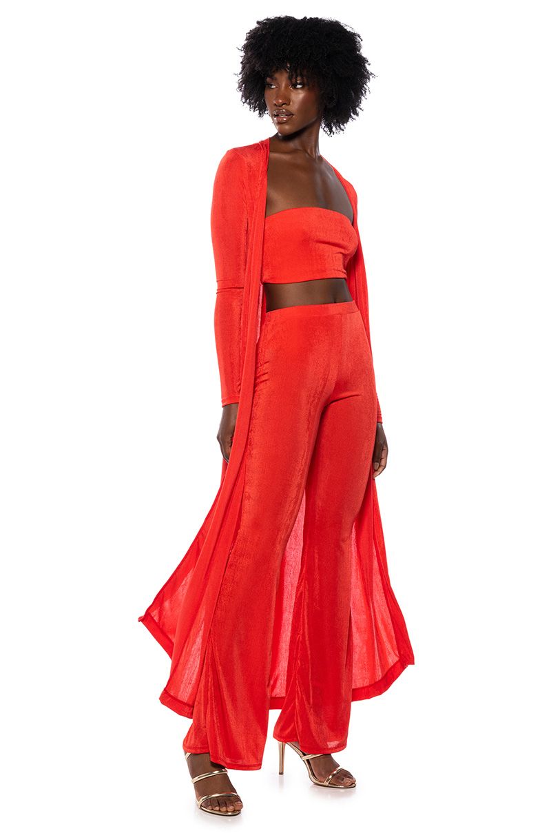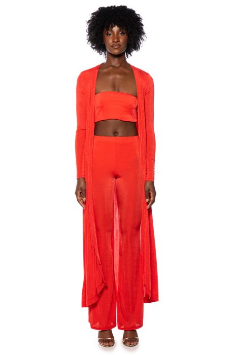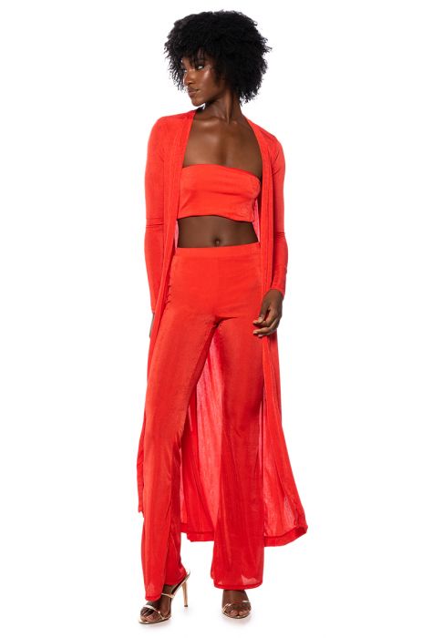 Instant chicness. The AKIRA Label Easy To Wear Maxi Long Sleeve Cardigan is a textured stretchy layering piece featuring long sleeves, an open front, and a maxi length silhouette. Pair this duster with the coordinating AKIRA Label Easy To Wear Bandeau Top and Easy To Wear Wide Leg Palazzo Pants. - 91% Polyester 9% Spandex (all measurements approximate from size small) - 52” Shoulder to Hem - 26” Sleeves - Imported Product ID: 294648