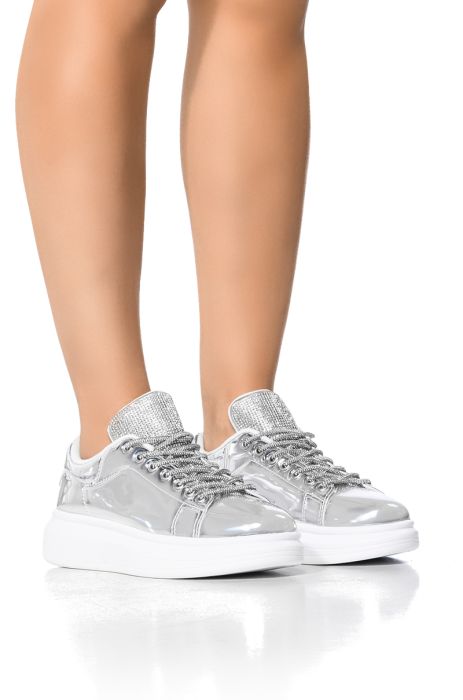 Shine bright in The Gleam Team Metallic Sneaker In Silver. This glamorous shoe features a faux patent leather upper, a classic lace-up vamp, rhinestone-embellished laces, and a subtle flatform rubber sole. Complete with an almond toe silhouette and a low-cut collar. (All measurements approximate from size 8): - Faux Patent Leather Upper - Almond Toe - Flatform Sole - 1.5” Sole Height - Imported Product ID: 373920