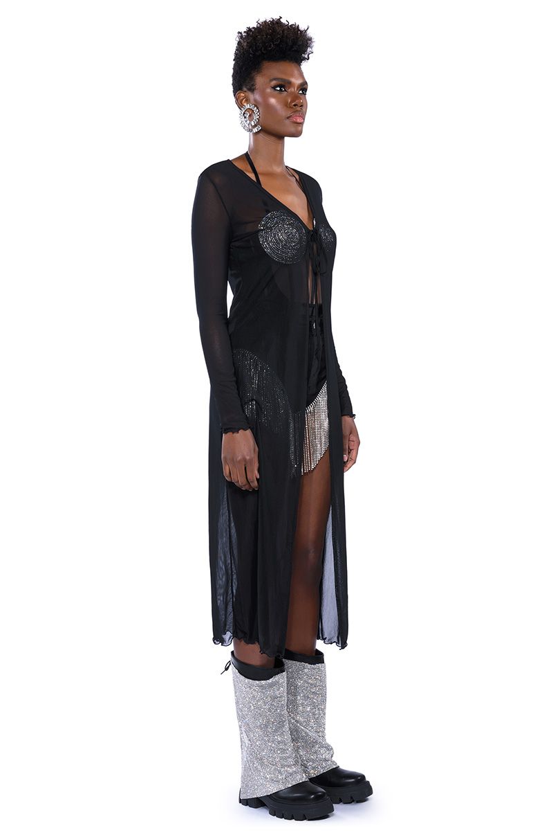 Show up in The AKIRA Label Here For It Duster! This essential cover-up duster is made from a lightweight, mesh base fabrication, and is complete with long sleeves with lettuce trim, a maxi length body with a lettuce trim bottom hem, an exposed front, and a front tie closure. Style over a bralette, relaxed cargos, and platform sandals for an ethereal, y2k look. - 100% Polyester - 50” Shoulder to Hem - 25” Sleeves (all measurements approximate) - Model is wearing size small - Imported Product ID: 337416