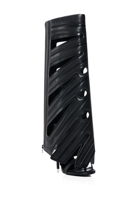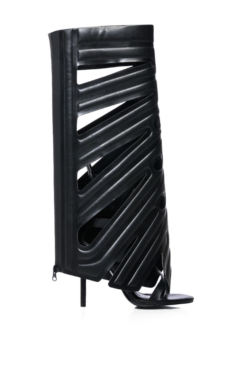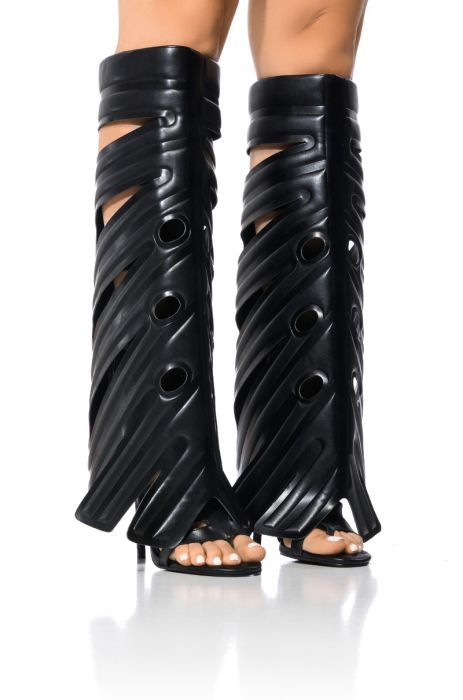 The Leaf Plant Design Gladiator Sandal In Black is made from a faux leather upper and features an open almond toe thong silhouette, a strappy, zippered, knee-high gladiator shaft, a coordinating, faux leather outer shaft with leaf-inspired cutouts, and a slim stiletto heel. Complete with a back zipper shaft closure. (All measurements approximate from size 7.5) - Faux leather upper - Open almond toe - Stiletto heel - 4.5” heel height - 16.75” shaft height - Imported Product ID: 355895
