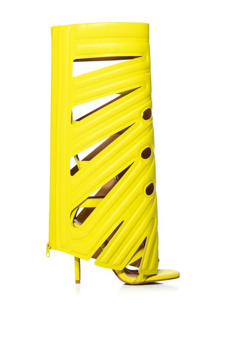 The Leaf Plant Design Gladiator Sandal In Lime is made from a faux leather upper and features an open almond toe thong silhouette, a strappy, zippered, knee-high gladiator shaft, a coordinating, faux leather outer shaft with leaf-inspired cutouts, and a slim stiletto heel. Complete with a back zipper shaft closure. (All measurements approximate from size 7.5) - Faux leather upper - Open almond toe - Stiletto heel - 4.5” heel height - 16.75” shaft height - Imported Product ID: 355904