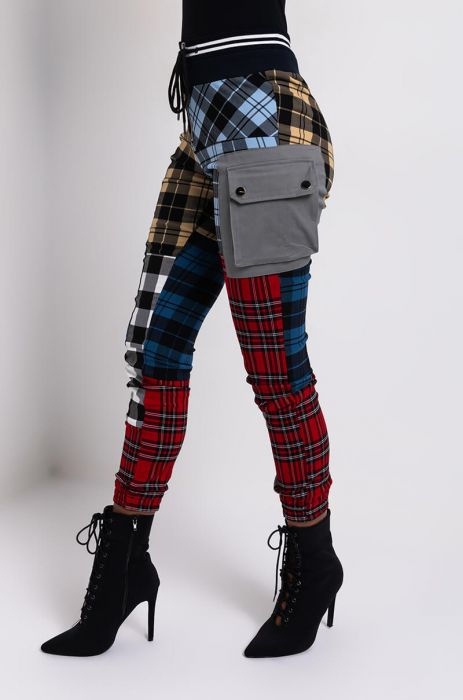Don’t worry about me, I’m having the time of my life in my AKIRA Label Mind Your Business Multicolor Plaid Pant. These bottoms feature a patchwork design of various plaid types, two thigh flap pockets, a thick elastic drawstring waistband, and a front zipper enclosure. Style these with a simple basic tube top and a pair of stiletto booties. - 72% Cotton 20% Polyester 8% Spandex (all measurements approximate from size small) - Hand Wash Cold - 39.5” Waist to Hem - Model height is 5'9" - Imported Product ID: 226375