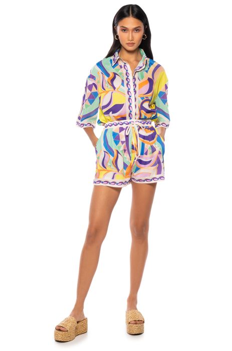 The AKIRA Minding Mine Drawstring Short is part of a colorful, two-piece set made from a non-stretch, lightweight fabrication. It features a high waist, an elastic drawstring waistband, hidden side pockets, and a vibrant, graphic print. Complete with a soft inner short, mini length, and a slip-on fit. Pair this loungewear moment with the matching top, The AKIRA Label Minding Mine Button Up Blouse, slides, and shades for an effortlessly bold look. - 100% Polyester (all measurements approximate from size small) - 13” Rise - 2” Inseam - Model is 5'10.5" - Imported Product ID: 365569