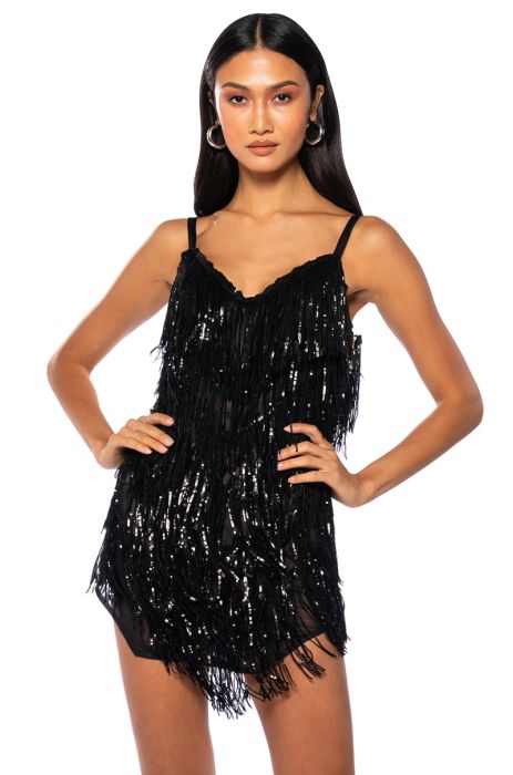 SHOW OUT FRINGE MINI DRESS IN BLACK