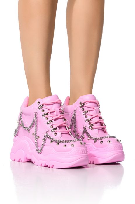 Complete your out-of-this-world ensemble with The ANTHONY WANG Space Candy Pink Embellished Sneaker. This edgy club kid-inspired shoe features a faux leather upper, a lace up vamp, silver metallic hardware, studded detailing, draped chain link embellishments, and a treaded platform sole. Pair with spandex basics for an elevated look. (all measurements approximate from size 7.5) - Faux Leather Upper - Round Toe - Platform Sole - 4” Shaft Height - 3” Platform Sole Height - Imported Product ID: 363136