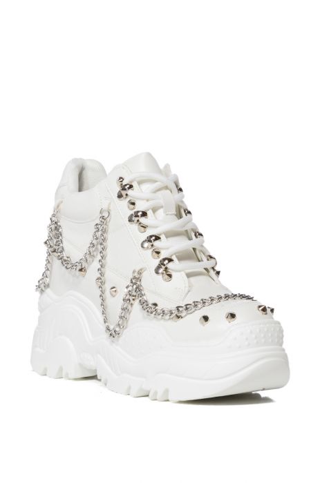 Complete your out-of-this-world ensemble with The ANTHONY WANG Space Candy White Embellished Sneaker. This edgy club kid-inspired shoe features a faux leather upper, a lace up vamp, silver metallic hardware, studded detailing, draped chain link embellishments, and a treaded platform sole. Pair with spandex basics for an elevated look. (all measurements approximate from size 7.5) - Faux Leather Upper - Round Toe - Platform Sole - 4” Shaft Height - 3” Platform Sole Height - Imported Product ID: 363128
