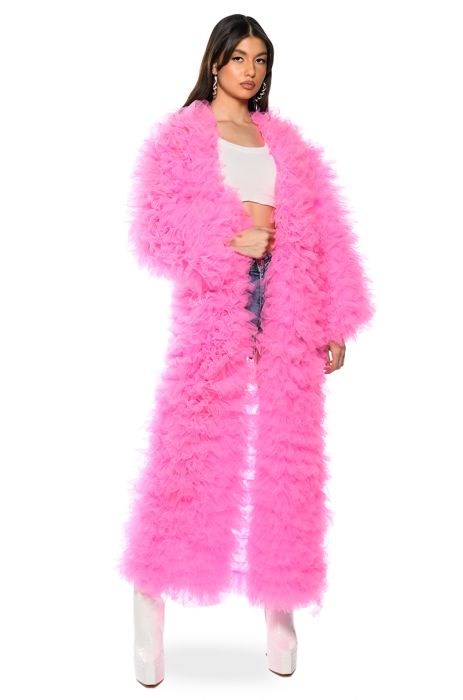 The crowd is going wild! Greet them in style in The AKIRA Label Take A Bow Avant Garde Ruffle Trench In Pink. This stage-ready piece is made from a sheer mesh fabrication and features layered dramatic ruffle body detailing, long sleeves, an open front, and a maxi-length silhouette for all the drama. - 100% Polyester (All measurements approximate from size small) - 55’’ Shoulder to Hem - 25” Sleeves - Imported Product ID: 335803